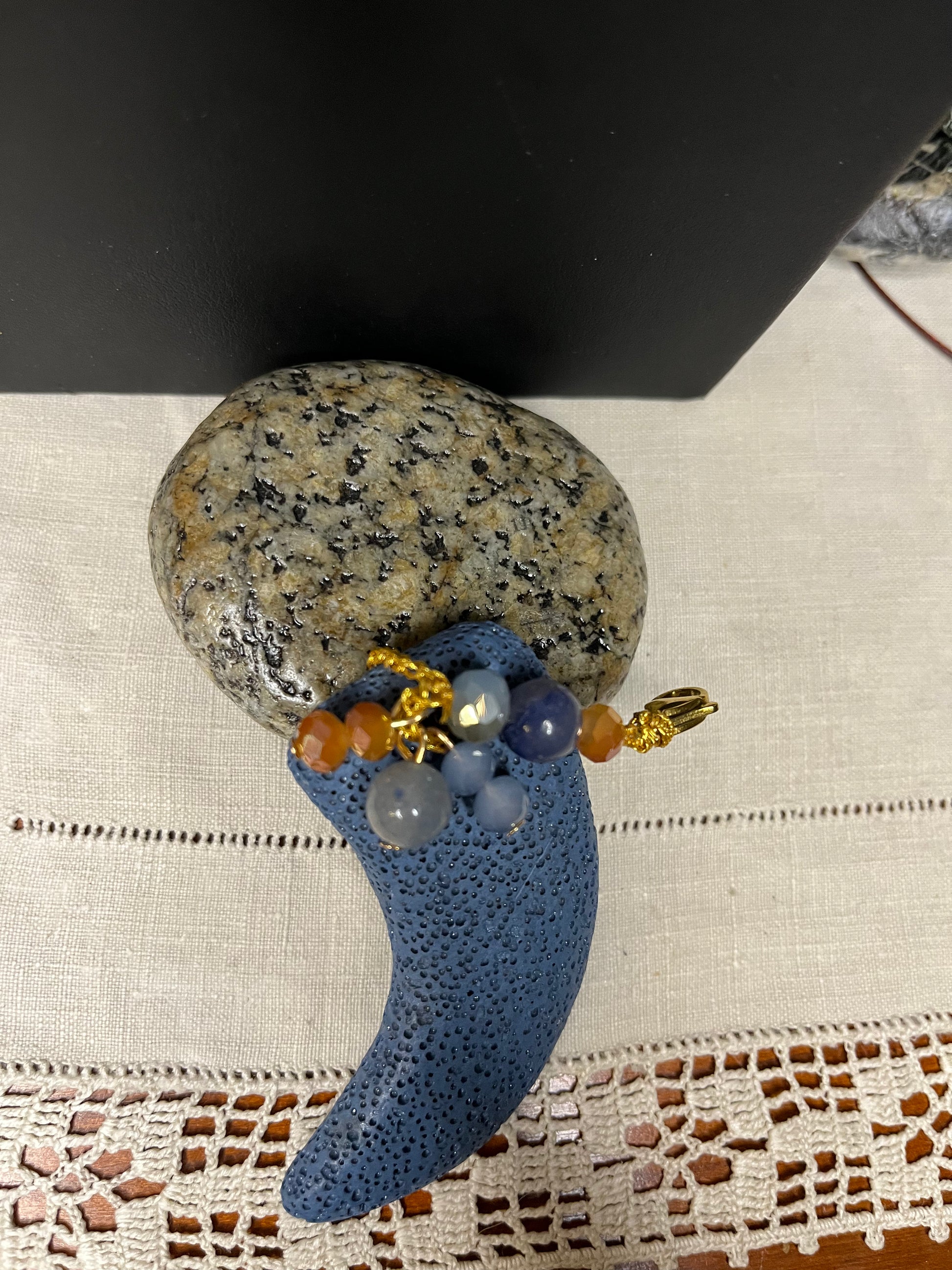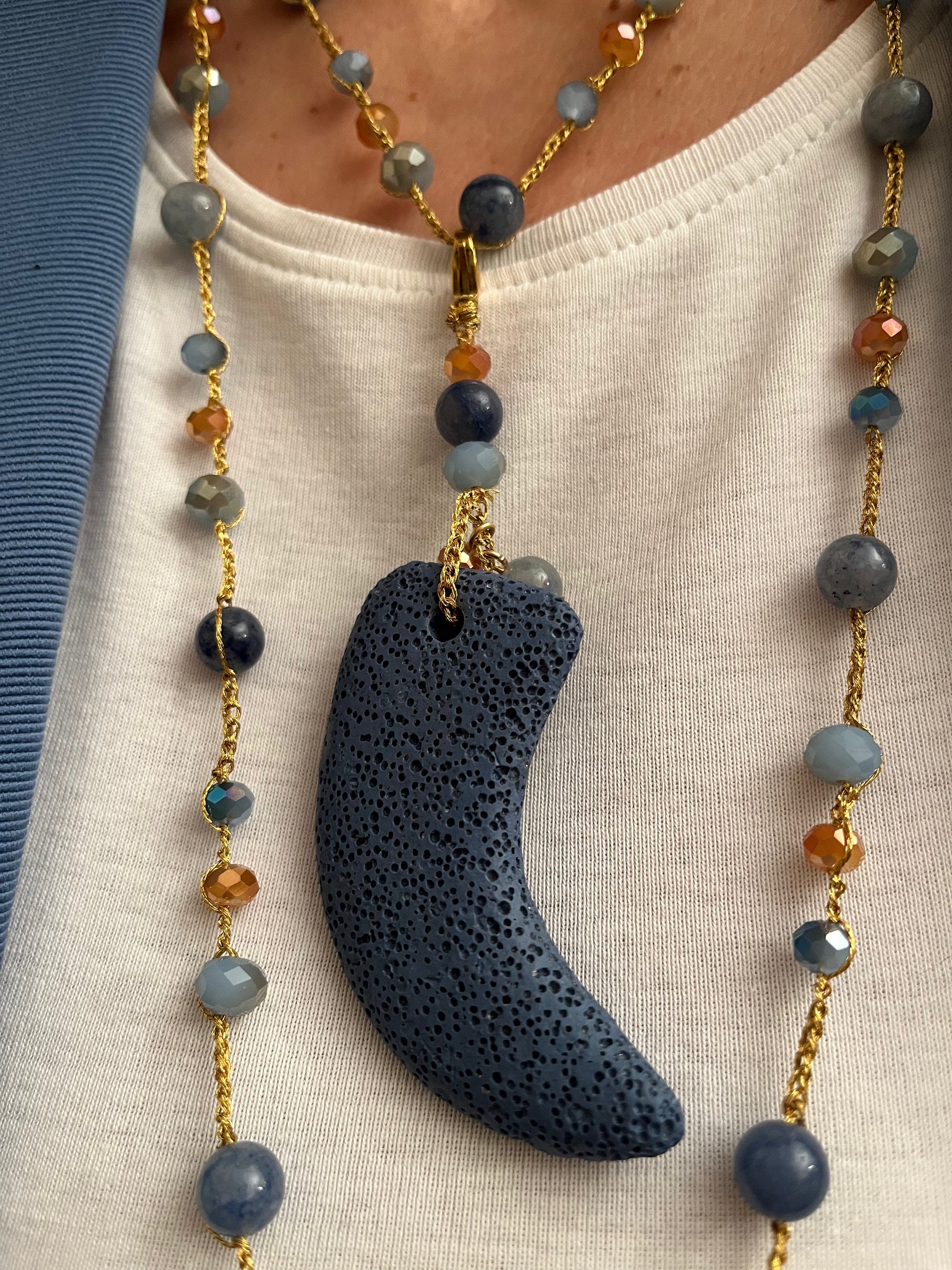 Collar tejido a crochet con hilo dorado, piedras naturales y de cristal.