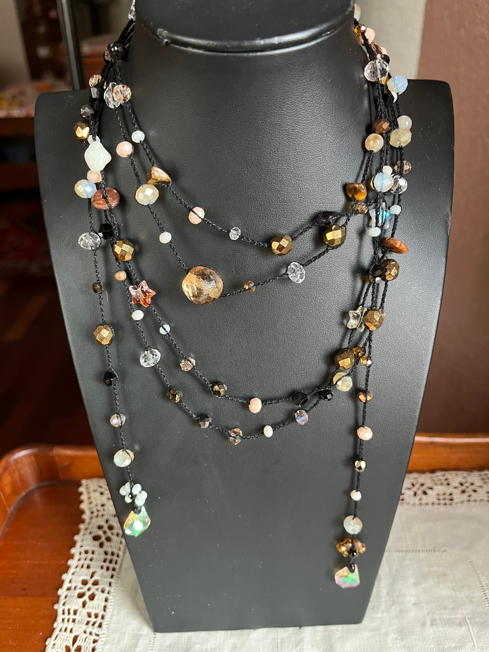 Collar tejido a crochet con hilo negro, piedras de cristal