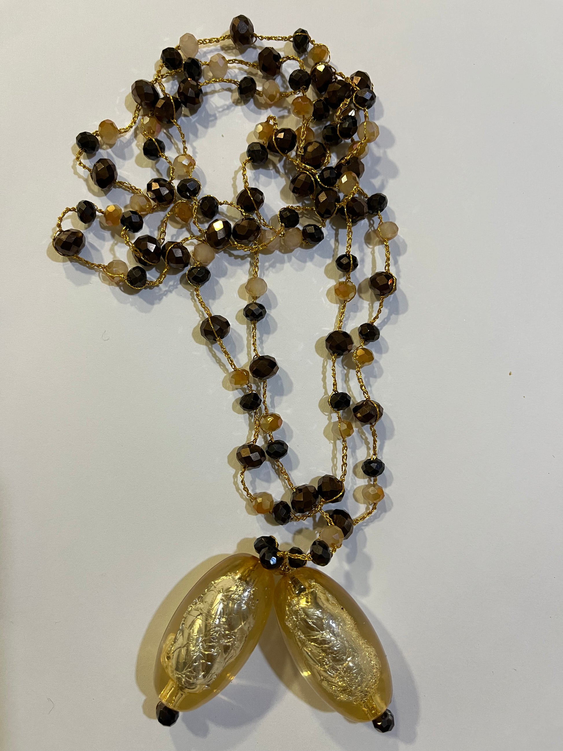 Collar tejido a crochet con hilo metalizado dorado, piedras de cristal marrón y bolas en resina.