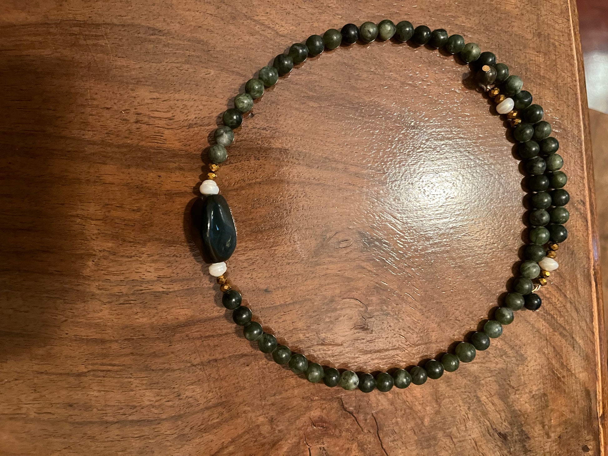 Collar montado con piedras naturales en tonos verdosos.