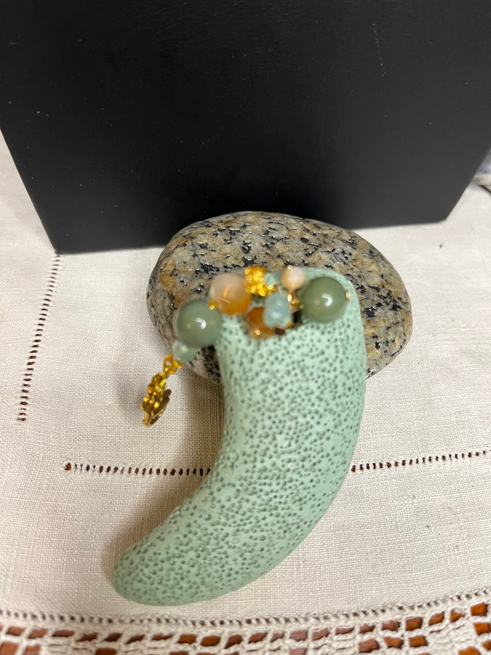 Collar tejido a crochet con hilo dorado, piedras naturales y de cristal.